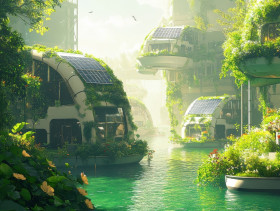 river powered floating villages clean energy supporting eco friendly homes solarpunk aesthetic movement sustainability modern urban future renewable green environment self sufficient innovation technology city power nature vegetation harmony architectural development balance infrastructure water futuristic designImagine Buddy