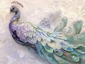 Elegant peacock with detailed lace feather patterns inspired by vamberk lace, showcasing intricate textures and delicate design in a graceful pose