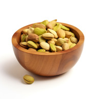 Pistachio nuts in a wooden bowl with white background, pistachio nut image