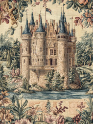 castle medieval stitched detail gobelin tapestry weaving textile intricate architecture historical looms woven fine design art fortress antique artistic texture embroidery decorative landscape stone majestic landmark ancient craft pattern regal ornamental cultural heritage classic masterpieceImagine Buddy