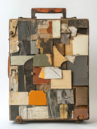 A suitcase made of leather and mixed materials, creating a vintage abstract assemblage, arman assemblage blending travel and craftsmanship
