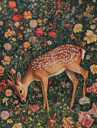 Deer grazing in a sunlit meadow surrounded by blooming flowers, peaceful nature scene, millefleurs tapestry design, wildlife in a serene floral landscape