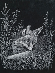 Fox curled up in dense undergrowth, resting in a peaceful forest setting, detailed scraperboard art captures fine fur texture and foliage in black scraperboard style