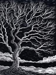 tree gnarled silhouetted storm clouds branches twisting wind eerie textures moody contrast scraperboard art black dramatic detailed weathered aged engraving illustration shading bold night foreboding rugged textured nature solitude mystic engraving intricateImagine Buddy
