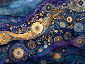 Interlocking gears fade into a wave like design, blending mechanics with stitched shibori, shibori silk enhances the fluid movement of traditional shibori patterns
