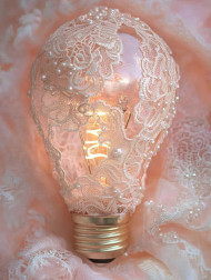 A lightbulb glowing with lace filigree, intricate chantilly lace fabric patterns radiating with light, merging vintage charm and chantilly lace material artistry