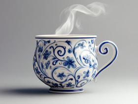 cup steaming ornamental blue swirls gzhel pottery russian porcelain elegance warmth tradition delicate intricate ceramic decorative vintage handmade folk art inspired culture motif craftsmanship heritage classic detailed beverage hot tea drink unique artistic ornateImagine Buddy