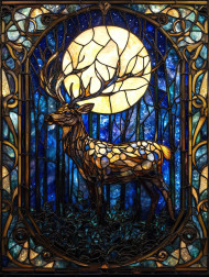 Majestic stag standing in a moonlit forest, illuminated by ethereal light, surrounded by towering trees, vitrail mirror effect enhances the magis vitrail glow