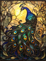 Peacock with a fanned iridescent tail, shimmering in vivid hues, reflecting intricate vitrail mirror patterns, magis vitrail artistry highlights its regal beauty