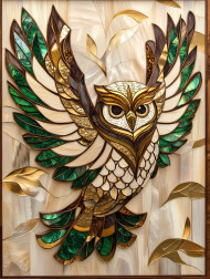 owl soaring gliding brass feathers inlay shimmering sky light intricate craftsmanship artistry majestic elegant detailed nocturnal avian raptor predator flight movement handmade luminous gold delicate aerial hovering freedom vintage fine luxurious shadow glowing natureImagine Buddy