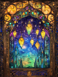 Lantern festival under a starry sky, glowing with warm lights and colorful reflections, magis vitrail design enhances the vitrail mirror brilliance