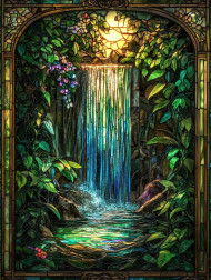 Waterfall cascading through lush greenery, bathed in shimmering light, magis vitrail details enhance the vitrail mirror reflections in this serene scene