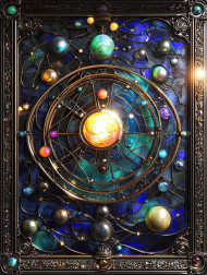 Celestial orrery with glowing planets, orbiting in a cosmic dance, magis vitrail artistry highlights the vitrail mirror reflections of the universe