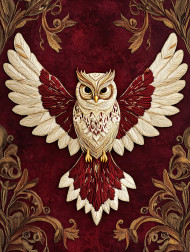 A soaring owl with feathery wings detailed in soutache-like embroidery, the swirling soutache cord accents enhance texture, etsy soutache-inspired artwork