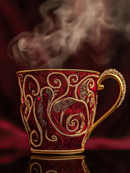 A steaming cup decorated with soutache embroidery style accents, adding a cozy, artistic touch, elegant soutache cord swirls, etsy soutache-inspired design