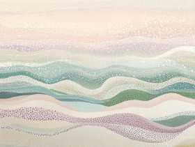 Waves rolling onto the shore with stippled foam and sand textures, the stippling technique captures the movement of water and the fine details of the beach