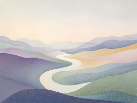 A winding river with stippled shading on hills, flowing through a scenic landscape, the stippling technique enhances the depth and texture of the terrain
