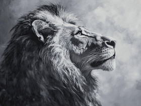 lion majestic powerful mane strength grace acrylic grisaille painting monochrome wild animal predator nature regal wildlife portrait detailed grayscale art canvas brushwork expression texture shading realistic intense striking noble feline stance composition traditional technique illustration beautyImagine Buddy