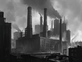 Industrial factory buildings silhouetted against the sky, rendered in monochromatic tones, the acrylic grisaille technique emphasizes the stark architecture