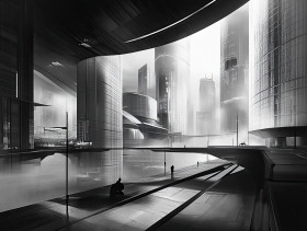 A cityscape with sleek, modern buildings depicted in gray tones, the acrylic grisaille method showcases the futuristic architecture lines and forms