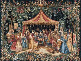 fair festival people tapestry flemish tapestry verdure antique woven historical medieval trade market detailed craftsmanship classic elegant european festive gathering celebration commerce storytelling ornate traditional textiles daily noble social rich city heritage entertainment rural outdoor nobility prosperity masterpieceImagine Buddy