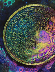 Engraved coin with tiny script, displaying precise lettering and intricate relief, the micrographia style brings out fine details in book micrographia etching