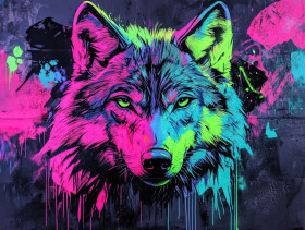 neon wolf aerosol street art glowing fur fierce eyes spray paint mural urban bold strokes effect custom technique graffiti predator wild animal fantasy luminous vibrant energy night colors detail intense design creative contemporary wallImagine Buddy