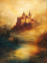 castle ancient mist morning stone walls historic mysterious fog medieval fortress ruins gothic eerie architecture landscape fantasy kingdom tower heritage europe weathered dramatic legend history grand cold structure scenic oil paint painting custom artwork brushstrokesImagine Buddy