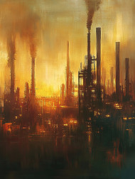 factory smoky chimneys thick smoke dawn sky industry pollution towering industrial metal clouds environmental cityscape toxic urban emission structure mechanical economy carbon dark environmental production fumes industrialization smog impact oil paint painting custom artwork brushstrokesImagine Buddy