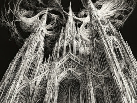 Gothic cathedral with towering spires and ornate details, exuding historic grandeur, scratchboard art emphasizing the dramatic architecture of sacred spaces