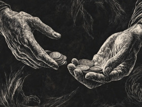 Hands exchanging coins over a ledger, symbolizing finance and trade, scratchboard art portraying business, commerce, and economic transactions