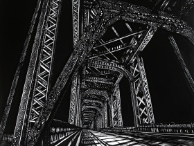 Towering steel bridge with riveted beams stretching across the skyline, scratchboard art showcasing industrial strength, architecture, and engineering