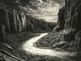 river winding rocky cliffs flowing rugged terrain nature beauty adventure exploration water landscape canyon valley stream scratchboard art illustration wilderness journey scenery erosion current tranquil meander gorge outdoor environment freshwater picturesque serene geological pristineImagine Buddy