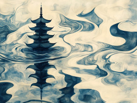 pagoda temple reflection water still suminagashi pattern serene landscape balance tranquility architecture cultural japanese peaceful artistic harmony abstract ink calm symmetry tradition beauty mirror sky ripple fluid meditation paper kit spiritual scenic zenImagine Buddy