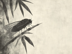 cicada bamboo leaf delicate insect chinese ink brush painting nature resilience beauty symbolic traditional asian artistic detailed wildlife serenity harmony zen soft summer fine elegance minimal perched small brown oriental silence tranquility fragileImagine Buddy
