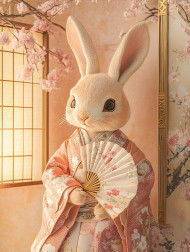 A rabbit wearing a colorful kimono holds a folding fan, resembling a hina doll, a charming display of hinamatsuri dolls celebrating japanese tradition