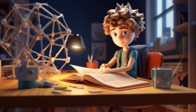 A boy sits at a desk in in class room front of a book, back to school stock images ai, back to school ai prompts
