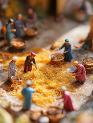 Tall glasses of rose-flavored milk with nuts and basil seeds arranged on a vibrant table, with five workers, eid al fitr miniature workers food photography