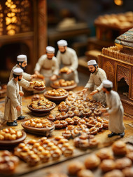 kunafa freshly baked crispy golden strands oozing cheese vibrant table four workers eid al-fitr miniature food photography traditional middle eastern dessert syrup sweet pistachios buttery shredded crunchy delicious festive gourmet hospitality homemade culture celebration muslim artisanal delicacyImagine Buddy