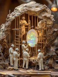 miniature workers jewelry photography gold frame opal iridescent centerpiece sandpaper polishing fine craftsmanship detail delicate shaping artisan gemstone micro tools engraving luxury metalwork handmade workshop custom unique precision glimmer exquisite design shining artistry collector specialist rareImagine Buddy