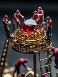 miniature workers jewelry photography ruby gold setting red prongs laser engravers craftsmanship fine delicate artisan intricate gemstone metalwork workshop polishing custom luxury elegant refined beautiful stunning masterpiece fashion unique brilliance collector glowing artistic detailed engraved premiumImagine Buddy