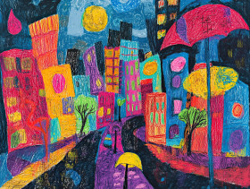 rainy city street glowing streetlights reflections wet pavement crayon drawing pastel pencil crayons litho urban rain scene nighttime lights shimmering metropolitan wetness moody sketch night artistic atmosphere downtown serenity architecture peaceful quiet solitude mystic vibrantImagine Buddy