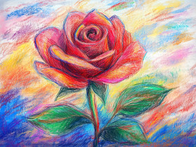 A single rose blooms with delicate petals, standing alone in beauty, crayon drawing with pastel pencil crayons and litho crayon, floral elegance concept