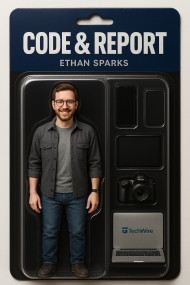Tech journalist ethan sparks in realistic collectible action figure style, digital reporting toy concept