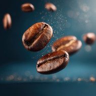 coffee beans roasted flying granules brown glossy texture macro food motion photography rich caffeine aroma detail splash roast gourmet still isolated flavor bean energy scattered shot closeup blur air crack heat dynamic bitter drink morning darkImagine Buddy