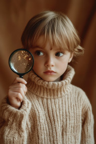 child magnifying starry knit sweater surreal editorial fashion portrait contemplative painterly dreamy 1970s vintage cinematic warm soft lighting shadows monochrome retro studio photo concept highfashion sand collar midjourney promptImagine Buddy
