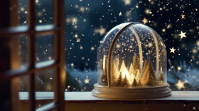 A wide-angle shot of a starry snow globe sitting on a windowsill, christmas stock image ai, christmas stock photos ai