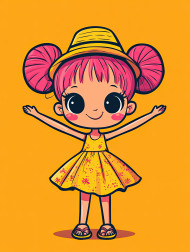 pink cartoon girl twirl arms beach hat yellow dress orange pop art midjourney prompt comic style portrait joyful summer motion fun youth fashion happy breeze outfit sunshine vibrant playful carefree expression light stylish colorful radiant swirlImagine Buddy