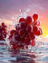 Red grapes splashing into clear water with droplets frozen in time, captured with sunset over a vineyard. vibrant colors and sharp details. fresh fruits photography, motion food photography, midjourney food prompts