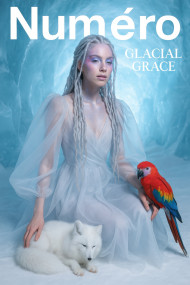 Ethereal model in icy tones with arctic fox and silver dreadlocks in glacier cave, surreal animal cover art, magazine cover, chatgpt image prompts, dreamy winter fashion look